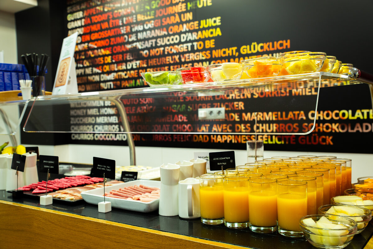 Zumo de naranja natural, productos sin gluten, cereales, lácteos, bollería y panes variados...