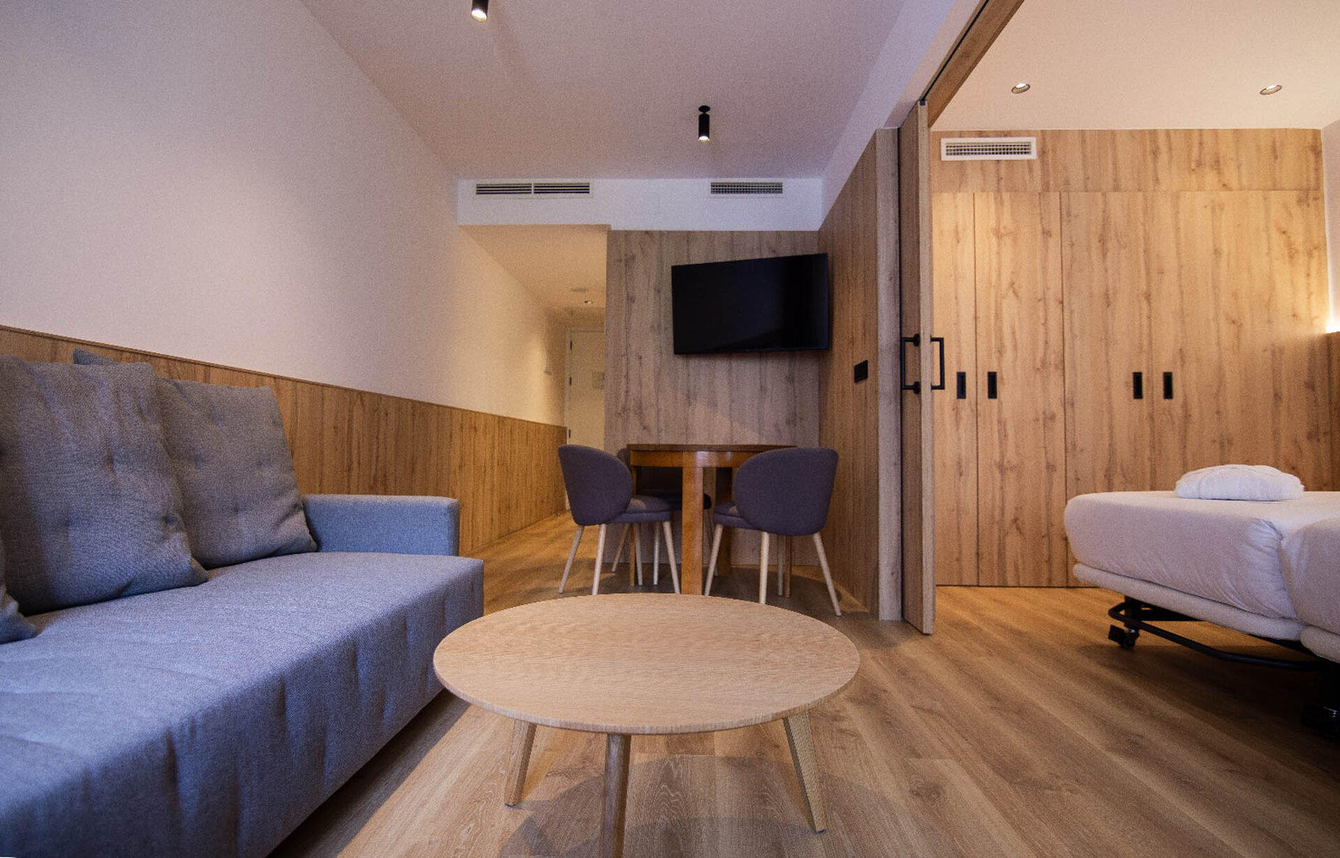 • Versatile living space with sliding privacy partitions.
