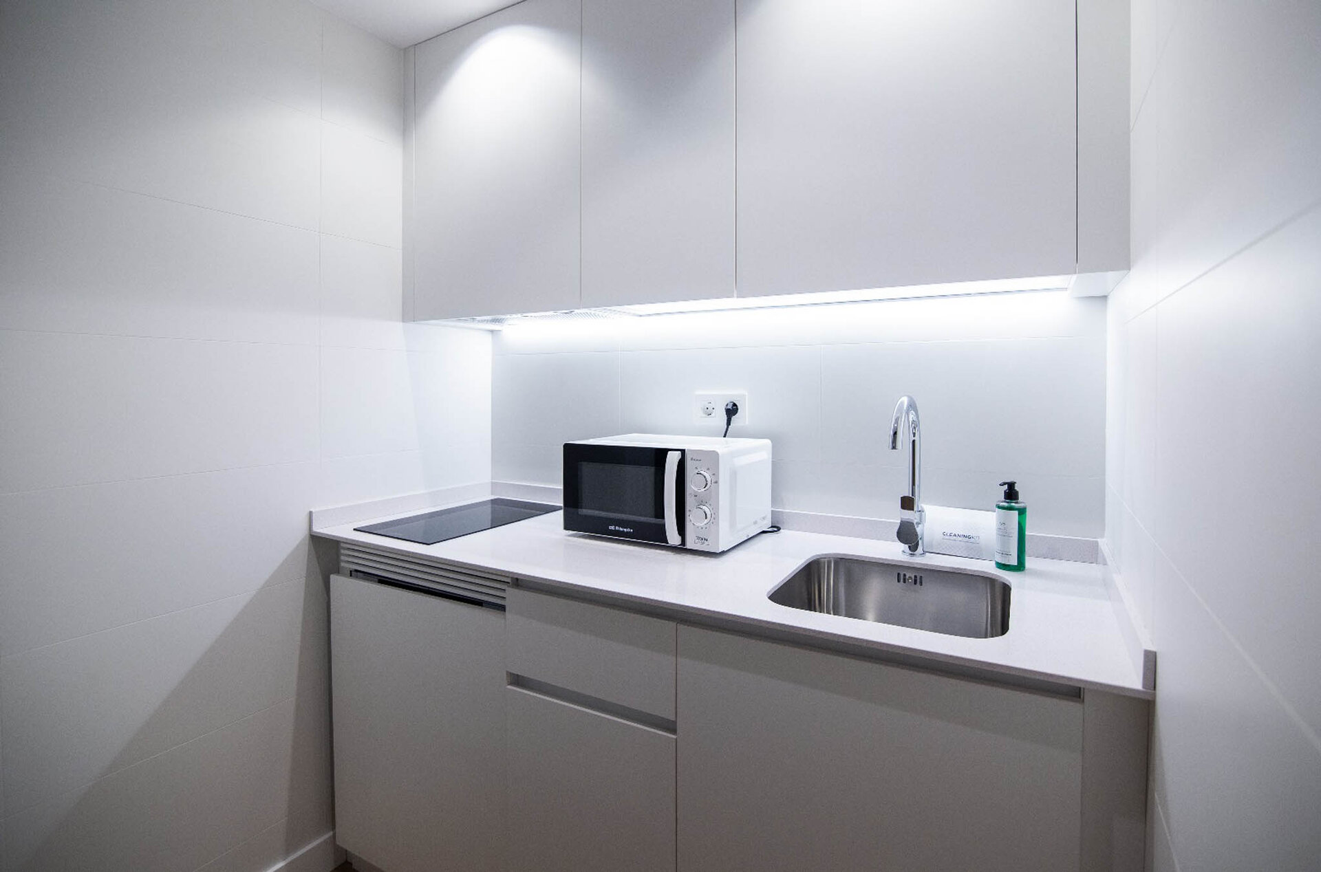 a white kitchen with microwave and sink Link to Larger Item Photo, ListItemCarouselImage3