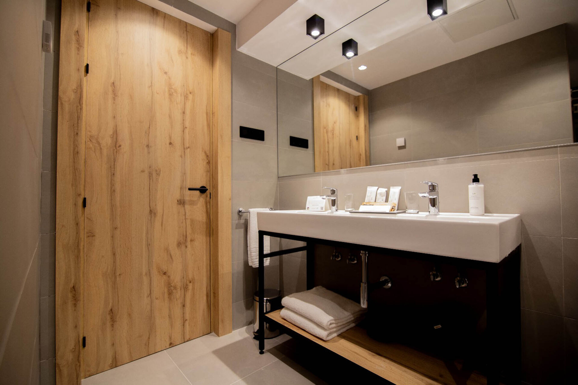 a bathroom with wooden door and sink Link to Larger Item Photo, ListItemCarouselImage2